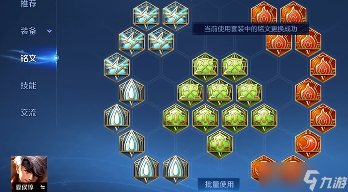 铭文搭配上,10宿命提供生命值、物理防御与攻速,助力快速触发二技能强化普攻,减少大招冷却;5调和与5狩猎兼顾续航、移速与攻速,让夏侯惇对线换血更灵活,清线刷野效率更高;10虚空提供生命值与冷却缩减,与装备冷却属性完美契合,进一步优化技能循环。这套铭文出装兼顾坦度、冷却、控制与续航,无论对线还是团战,都能让夏侯惇频繁释放大招,先手开团分割战场,或利用大招穿墙逃生、绕后切后排,大幅提升战场机动性与战术灵活性。