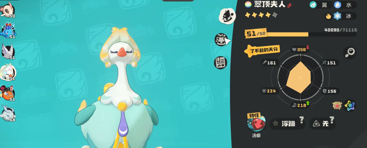 翠顶夫人是全能型增益继承者,最大的特点就是可以将增益效果传递给下一只出场的精灵,大大缩短了主力输出的蓄力时间。多段爆发阵容中它能够使得核心输出几乎不间断地使用技能,在PVE快速转火的时候,可以大大提高整个队伍的效率。被捕获在隐蔽处的滩涂右下角的湖里,使这种危险和喜悦感更加明显起来。对于喜欢高阶操作的玩家来说,翠顶夫人就是不可多得的战术利器。