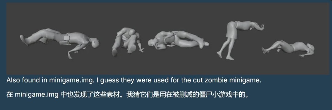 泄露的游戏文件中包含了大量早期版本的模型和资源,同时也揭示了多项目前被删减的内容。文件中出现了与传闻中“僵尸小游戏”相关的动画状态数据,该模式据称在正式版推出前被删除。