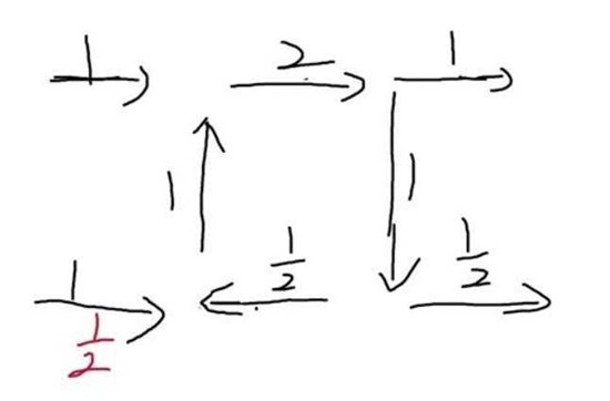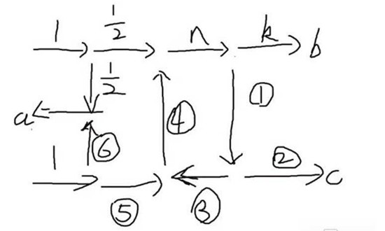 通过计算可以发现,a输出恒为1,且②=①/2=k/2,因此输出端b:c恒为2:1,于是b=2/3,c=1/3。堵塞情况是一般情形下的特殊情况,回流设备中n限制了b、c输出口的输出量,n最大为2。此时如果要整体不堵塞,只需要a口出水速大于1/2即可。通过调节a出口的流速可以实现b、c端口的增压,a初始流速为1则b、c初始输出为2/3、1/3,一段时间后a口降为1/2,b、c两口可增压为1、1/2。