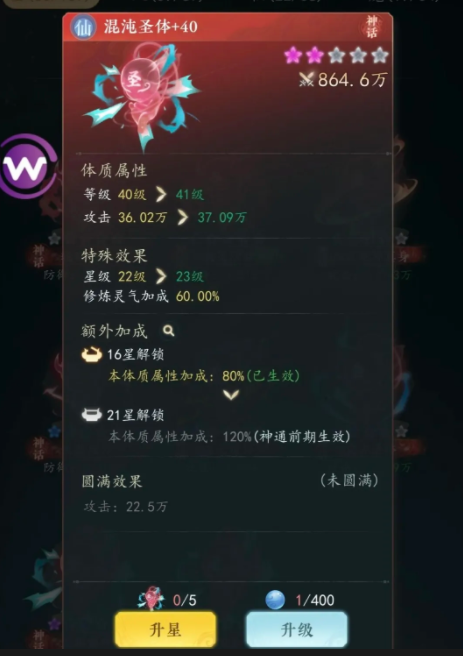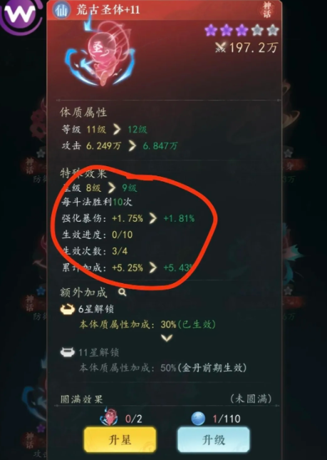 除了不同的体质区分之外,每个成员在获取体制之后需要进行养成,在挑战过程中养成会有不同的侧重点,在升级体制的时候,分成生命攻击和防御三个方向,每个方向都要尽力提升,通过平均化的养成,让每个成员的能力都能快速得到升级,红色是相对来说性价比最高的一个,通过氪金的方式可以获得混沌圣体,混沌圣体能提升体质等级,角色的攻击力和其他特殊效果也会随之提升,喜欢暴击流派的玩家可以尝试获取荒古圣体,能强化暴击伤害的同时,让角色有更优秀的表现。