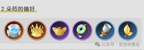 好感度每升5级,会有累计奖励,给星盘升级材料/粉球。朵菈的喜好礼物如下(只收喜好礼物,一定要提前留):