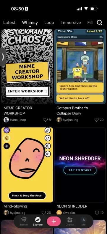 Loopit发现页,内容按Whimsy、Loop、