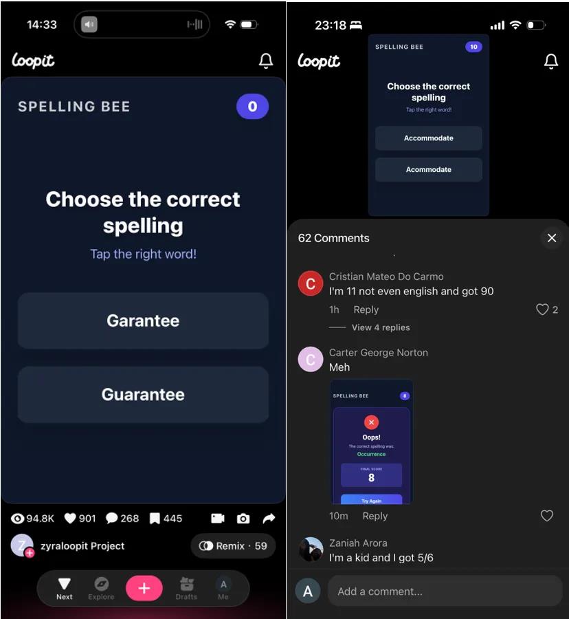 打开评论区,与短视频主要以“辣评”收获绝大多数点赞不同,「Loopit」每个互动内容下的评论区,更多是用户参与后的“晒分”。例如,在一个 Spelling Bee 拼写测验的互动内容下面,268条评论不是“666”或者表情包,而是用户在讨论自己的成绩,“我才11岁,英语不是母语,但我拿了90分”、“还有拿了8分就错误”的惜败。互动带来的高参与深度,在近几年的新上线社区产品中,很少见到。
