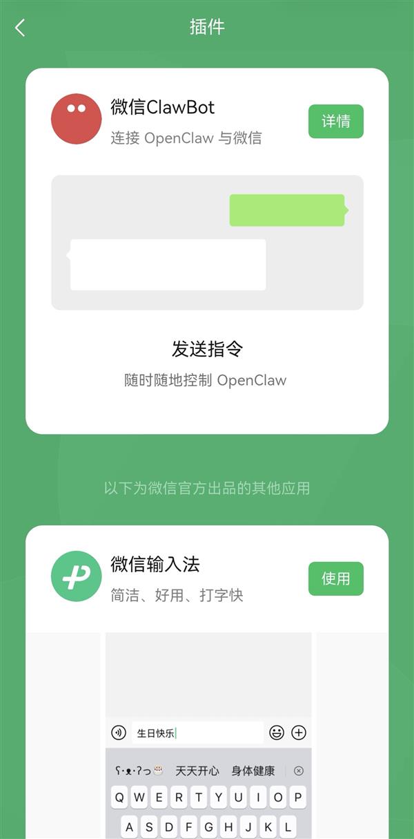 【设置方法】:在“我”-“设置”-“插件”里找到“微信ClawBot”,安装插件或扫码连接OpenClaw之后,就能在微信里与OpenClaw直接对话,指挥AI帮你干活。