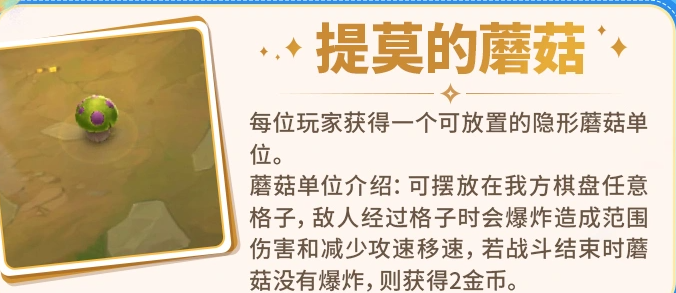 三、“提莫的蘑菇”:开局赠送一枚可部署隐形蘑菇,允许放置于己方棋盘任意空位。敌方单位经过时触发爆炸,造成范围伤害并降低攻速与移速;若整局未被触发,则战斗结算时返还2金币。