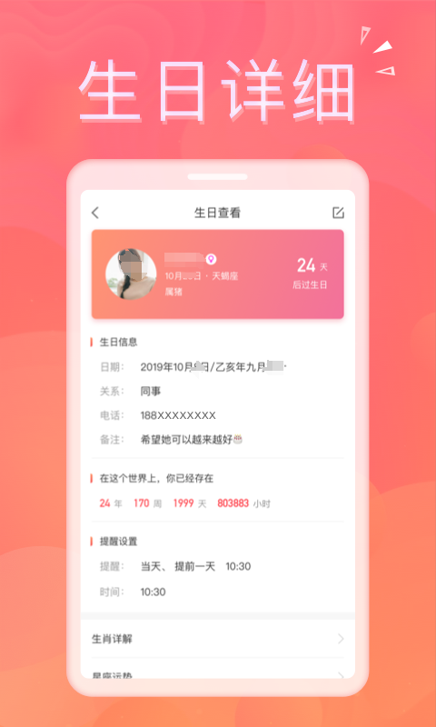 主打极简高效,输入年月日即可秒级输出完整生辰数据,支持公历农历双向切换。提供标准化生辰卡片生成功能,便于本地保存或社交分享;生日提醒支持1天、3天、15天等多档位预设,还可对重要联系人进行置顶标记,避免遗漏关键纪念日。