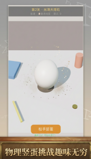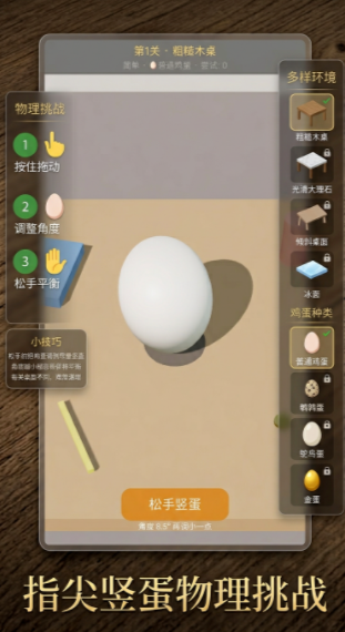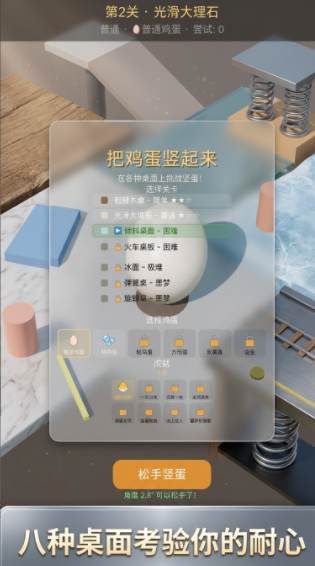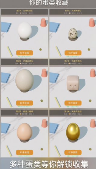 本作共设计8种差异化桌面材质——从光滑玻璃到粗粝砂岩,从弹性橡胶到微震木纹,每种材质对鸡蛋底部接触面的摩擦系数与形变响应均有独立建模。同时提供数十种可切换蛋类,涵盖新鲜鸡蛋(重心偏低,稳定性强)、陈放3天/7天/14天鸡蛋(重心上移,晃动幅度增大)等不同物理参数设定。关卡不设固定顺序,玩家可自由组合材质与蛋种,系统依据实际平衡持续时长、角度微调频次及姿态稳定性生成动态难度曲线。
