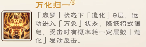 第四式【万化归一】同样要求造化层数达到9层。启动后亦清空造化,但进入的是「万象」状态。该状态下,招式调息时间同步减少;更重要的是,当角色被敌方攻击命中时,有概率消耗若干层造化(具体数值依当前配置而定),立即对攻击者发动一次反击。这一机制赋予该功法鲜明的反制特性,实现由守转攻的战术弹性。