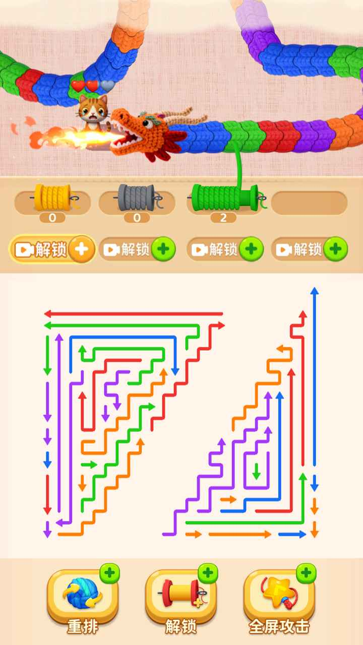游戏采用双线并行机制:一边整理箭头生成弹药,一边实时应对逼近的巨龙。巨龙自屏幕底部匀速向左推进,目标直指受保护的小猫。玩家需在限定时间内完成箭头调度,并将已生成的弹药精准投射至巨龙关节部位。值得注意的是,巨龙身体各关节具有固定颜色标识,仅对应色系的弹药方可造成有效伤害。屏幕顶部设有4个初始可用的线轴位,用于承接从巨龙身上掉落的不同颜色线团;当空间不足时,可通过观看激励视频解锁额外线轴位置,从而提升容错率与通关稳定性。