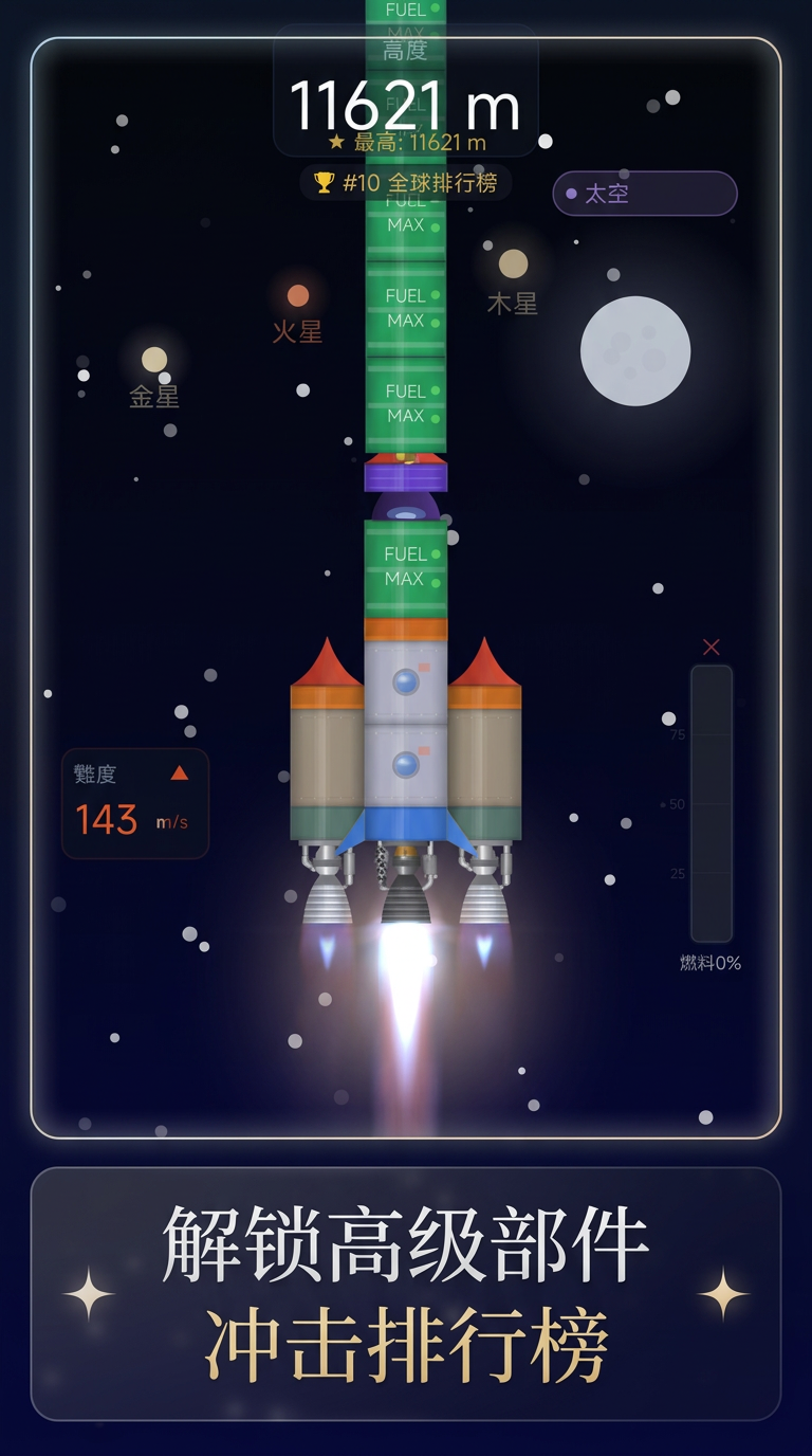每次进入组装界面,屏幕顶部实时显示当前火箭总质量、理论最大推重比、预估升限及结构稳定性评分等关键指标。玩家可据此动态替换部件、优化配重分布或调整级间分离逻辑。确认无误后,一键触发点火程序,目送火箭穿越大气层,直冲云霄。游戏内置动态排行榜系统,自动记录并同步每位玩家单次发射所达到的最高海拔数据,支持横向对比与历史回溯,激励持续迭代优化设计方案。