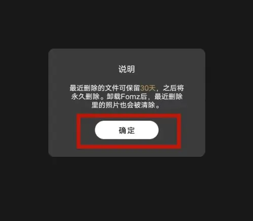 阅读相关说明,根据提示找回删除照片,点击确定提交Fomz软件完成操作。