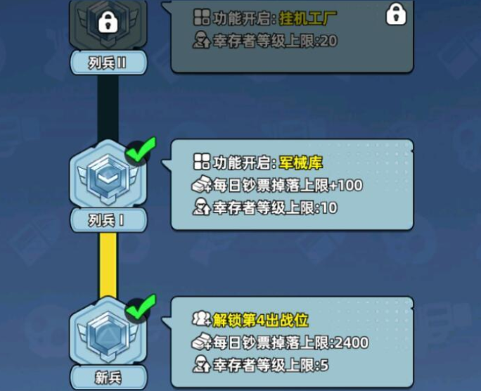 除战斗编组外,军衔还深度绑定资源产出效率。在资源即生命的废土世界中,高等级军衔直接转化为离线收益加成。军衔提升后,挂机工厂运转速率大幅提升,即便玩家离线,经验值、军牌、钞票与钻石的积累速度也会同步加快。尤为关键的是,达到指定军衔后,每日可领取双倍金币与钻石奖励,形成可持续的资源滚雪球效应。