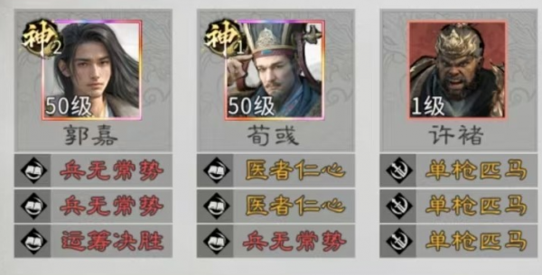 布阵还有兵种的搭配细节,也会决定阵容的强度。英雄站位上,郭嘉应该避开追击格让许褚站在两人的追击格上,就能最大化触发联动的效果。在兵种方面,他身后的追击格应该放置五斗米祭,才能有效提供续航,另外郭嘉还有许诸的正前方就应该安排一个西凉铁骑。在攻防兼备的配置下,才能更加放心的输出。技能搭配还有固定的思路,郭嘉就会有双主动技能。许褚搭配双追击的技能,那此时就可以稳定的收割残血,让定点狙杀更稳一些。