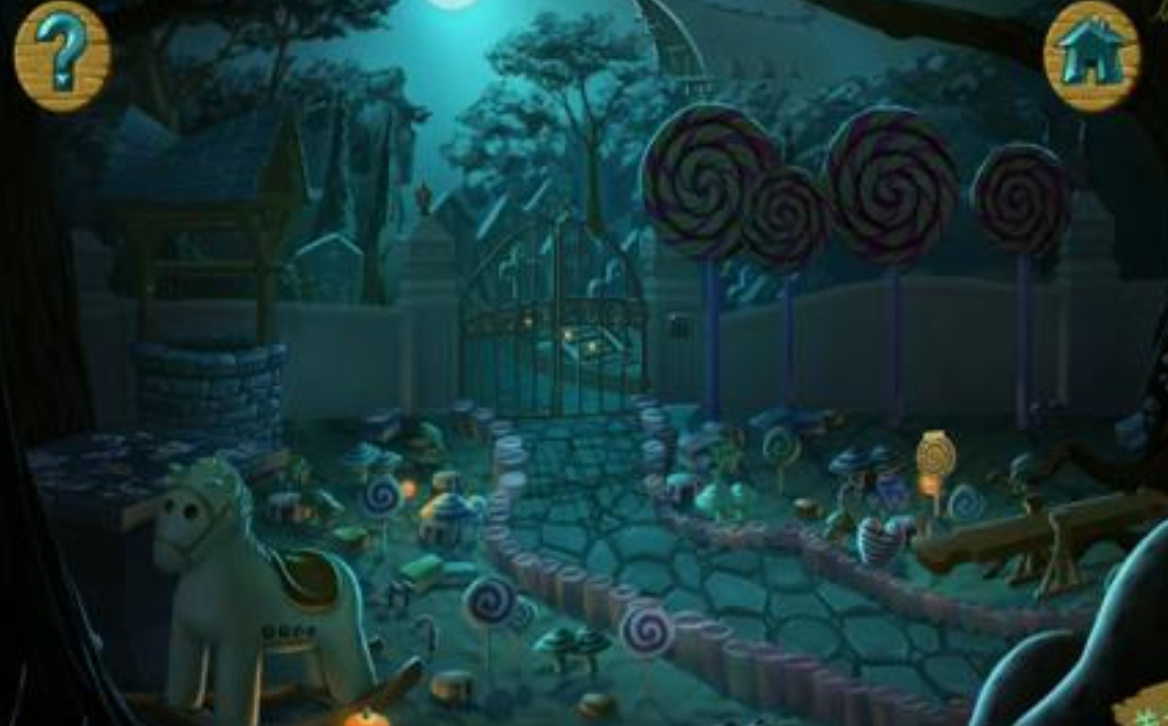 第二关转入糖果屋主题空间,谜题复杂度明显跃升。玩家需先获取棒棒糖造型道具,通过拼图重组获得小刀;屋内东、南、西、北四个方位的棒棒糖装置实为操作序列提示器。完成木柄安装后,依方向指令输入密码,触发绿色眼睛道具生成。使用小刀割断绳索,方可进入下一物品收集阶段。本关强调道具功能转化与空间方位感知,对观察精度与操作时序提出更高要求。