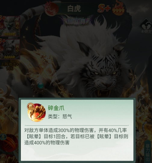 游戏中最厉害的神兽,那么就是白虎。这就是玩家公认的天花板级别输出,靠着爆发伤害,灵活的战术联动,还有阵容搭配就已经成为战斗场景中必须要争夺的核心角色。立绘凛冽霸气,利爪锋芒毕露,会完美地还原神话中的战神本色。在上手培养之后,很快就能够提升战斗力。白虎的核心竞争力,那自然就在于怒气技能碎金爪。作为单级攻坚的神技,基础性就可以打出300%的物理性伤害,还有40%的眩晕概率。