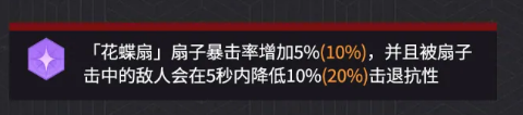 战技天赋「花蝶扇」提供高频随机打击能力:普通攻击有40%概率触发一枚火焰扇子,造成300%攻击力的魔法伤害。虽为概率机制,但在高攻速环境下实际触发率表现稳定。奥义系统中设有专项强化项,可提升该扇子暴击率5%–10%,并使被命中目标在5秒内降低10%–20%击退抗性。此效果与「水鸟之舞」形成有效联动,大幅延长敌人受控时间,强化追击与持续压制能力。