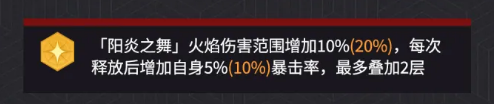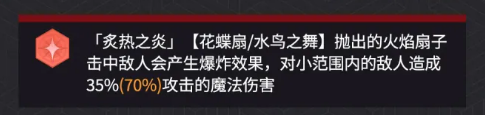 奥义系统中的「炙热之炎」提供额外范围收益:当「花蝶扇」或「水鸟之舞」的火焰扇子命中敌人时,将引发小范围爆炸,造成35%–70%攻击力的魔法伤害。单次爆炸数值虽不突出,但凭借高频触发与群体覆盖特性,在应对密集编队敌人时可显著提升清场效率。