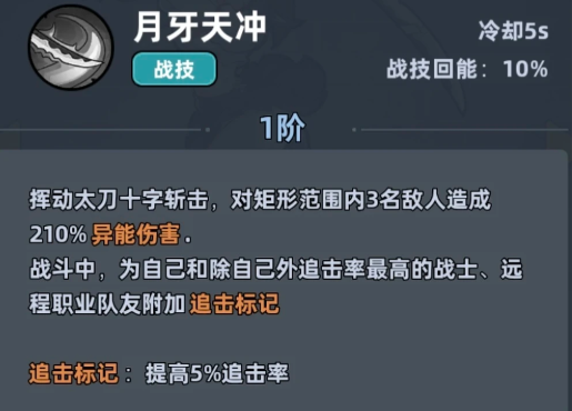 她的主动技能“月牙天冲”为十字形范围异能伤害,可同时命中多名目标,并为自身及队内追击率最高的战士或远程单位施加“追击标记”,提升全队5%追击触发概率。这一机制使其天然契合追击流体系,成为强化团队连动性的功能性核心。