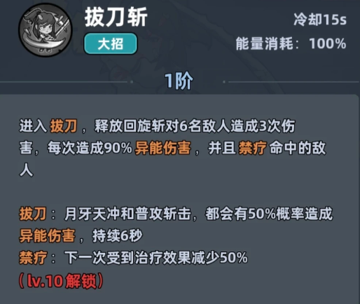 当“拔刀斩”升至高等级后,技能形态发生质变:进入“拔刀状态”,可对6名敌人发动3段回旋斩,每段造成90%异能伤害,且所有命中目标均附加禁疗效果。在此状态下,“月牙天冲”与普攻斩击均有额外加成——50%概率附加异能伤害,并延长6秒禁疗持续时间,大幅压缩敌方治疗空间。