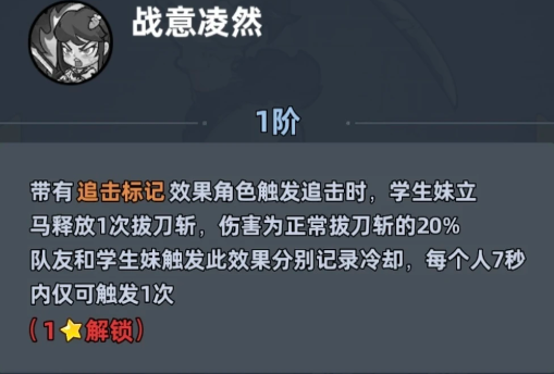 被动技能“战意凌然”构成其战术闭环:当任一携带追击标记的角色触发追击时,学生妹将立即释放一次20%倍率的拔刀斩,该效果独立计算冷却(每人7秒内限1次)。这一设计使其无需承担主C职责,转而专注辅助增益——通过稳定提供追击标记与高频协同爆发,完美服务于物理追击流体系,例如与“赛博剑圣”等高爆发角色搭配,可显著放大整体追击伤害总量,实现资源投入少、实战收益高的高效组队逻辑。