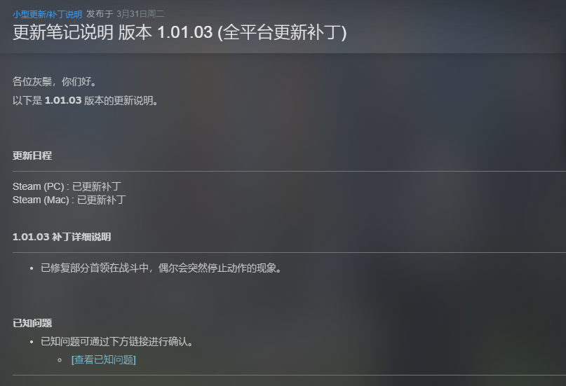 该补丁的唯一目标是修复一个严重错误:部分BOSS在战斗中会突然停止移动,不再对玩家的操作做出反应。目前,该修复已通过Steam成功推送到PC和Mac版游戏中。热修复在PlayStation、Xbox以及Epic Games Store和Mac App Store上的上线有所延迟,但工作室承诺将尽快在这些平台推出。