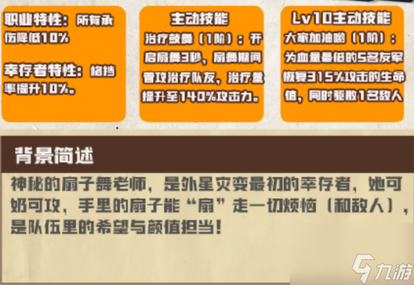 扇子女是新手玩家最好的伴侣,前期的阵容配置要保证有输出、坦克、治疗三个角色。相比空姐这样纯治疗型的角色而言,扇子女的功能性更全面。在以机甲战士(主力输出)、爱达(核心辅C)和变异人(前排坦克)为主要组成元素的常规开荒队伍当中,扇子女能够很好地承担起团队治疗的角色。她不仅可以给病人提供必需的血量,而且她的魔法系属性也给以后转型留有余地,使玩家能够平顺地渡过新手期。