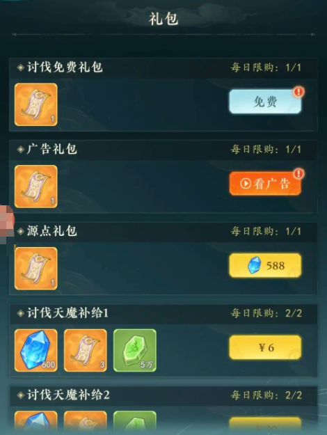 在和天魔对战的过程中,建议玩家多去选择一些强力法宝,法宝等级越高,能带来的伤害也就越大,假如玩家自身的等级能力不足,可以尝试在游戏里购买礼包,特定礼包会根据内容不同,划分出不同价格等级,玩家可以根据自身能力选择特定礼包购买,借助礼包里的法宝,让自己拥有更强战斗力,游戏里每天限定领取一个套娃礼包,通过观看广告也能领取讨伐卷轴,每天玩家都可以免费获取两个卷轴,想要参与挑战的玩家可以先来领取礼包。