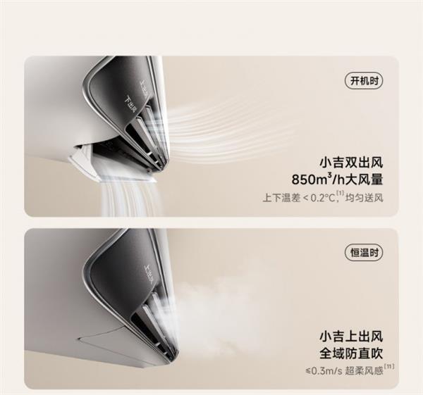 针对传统空调冷风直吹、热风不均的问题,小吉搭载智慧双出风系统,采用上出风贴顶、下出风贴壁的送风设计,气流沿着天花板与墙面自然蔓延,形成全屋环绕柔风,真正实现“有风不见风”。