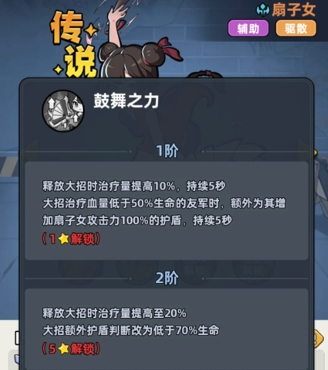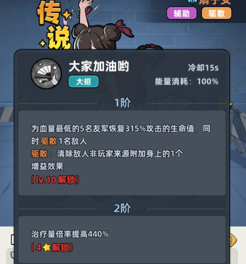 大招是它的核心亮点,十级解锁之后就可以冷却15秒,消耗百分百的能量。一阶就可以给血量最低的5个友军去恢复315%攻击的生命值,而且还能驱散一名敌人去获得更好的辅助效果。这一个驱散能力就是他能够和其他辅助区别的关键,面对增益Buff的Boss时,就会拥有很显著的效果。大招在后续升级时,治疗倍率还会提升到440%。被动技能鼓舞之力,就可以让治疗更具有保护性。一阶释放大招时,治疗量可以提升10%给血量低于50%的友军附加100%攻击力的护盾。