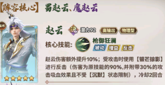 这里一般情况下阵容里面他们能够用到足够多的反击来打出额外伤害数值的话,就是反击队的核心能力了,所以在其中选用的角色就是用蜀赵云搭配魔赵云,这是阵容里面的核心,想要快速消灭敌人的话,这里的反击概率是一定要非常高的,而且对于其中武将要求的话他们的发挥一定要很稳定,才会更适合平民玩家来选择,这个阵容当中用到这两个武将,其实他们潜力都是比较高的,至少在前期的潜力上面都达到了90以上的得分,这两个赵云目前在自身获取的难度上面,魔赵云获取是更难一些,前期的蜀赵云还是比较好获取的,那么只要他们组成了搭配效果的话,其中双赵云的反击体系就可以达成搭配能力。