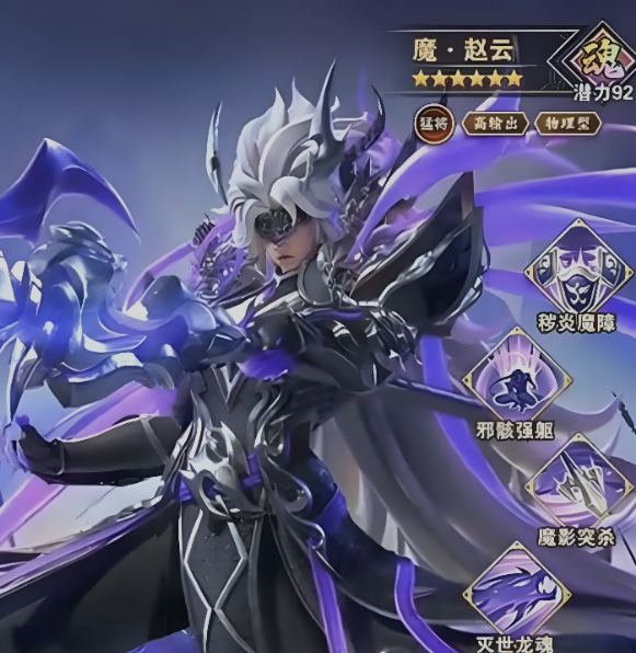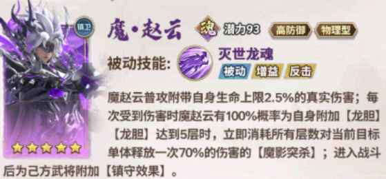 另外魔赵云的效果当中具有一个高防御数值,就可以保证防护好这里的蜀赵云,那么魔赵云他跟属赵云一样的都走物理路线,在这里他可以带来的被动能力叫做灭世龙魂,这个被动能力会让他在进行普攻的时候,带的自身生命上限数值达到2.5%的真实伤害,而且每一次进行攻击的时候,他只要受到对面伤害,就会有一个百分百的概率,此时可以给自己带来龙胆状态的附加,龙胆这个状态在他身上体现的时候,是会有2%的额外防御数值加成,而且在最多的时候是可以叠加到5层的,并且龙胆只要成功的触发以后是不可能被敌人给驱散的,所以目前持续的时间达到4个回合的时候,他的龙胆能够给他带来的生存机制是非常强的。