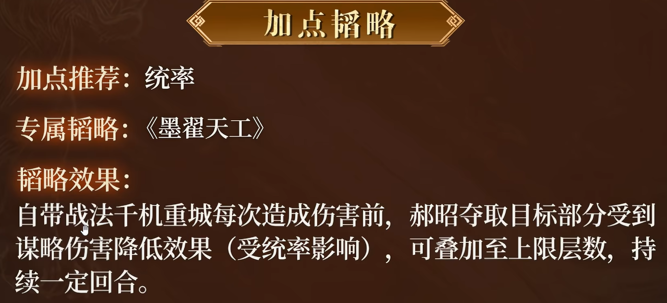 加点方面,郝昭推荐加统率。原因也很直接,千机重城的好几个效果,包括获得抵御的概率、受到伤害降低的幅度、谋略伤害提升的幅度,都是受统率影响的。统率越高,这些效果就越稳越强。所以加点没什么太多纠结的地方,统率优先就对了。
