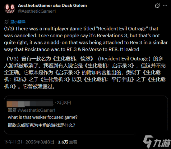 来自NateTheHate、Dusk Golem和Screenfire Germany,NateTheHate称其为一款多人游戏,Dusk Golem表示它既是多人游戏,也是《生化危机:启示录3》的附属内容。