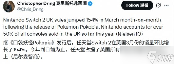 从克里斯托弗·德林(Christopher Dring)发布的一条推文中可以了解到,他通过Nielsen IQ获取了相关信息,数据显示Switch 2在3月份的销量相较于2月份激增了154%,这与《宝可梦 Pokopia(Pokémon Pokopia)》的发布时间相吻合。值得一提的是,3月份相较于2月份多出一周。