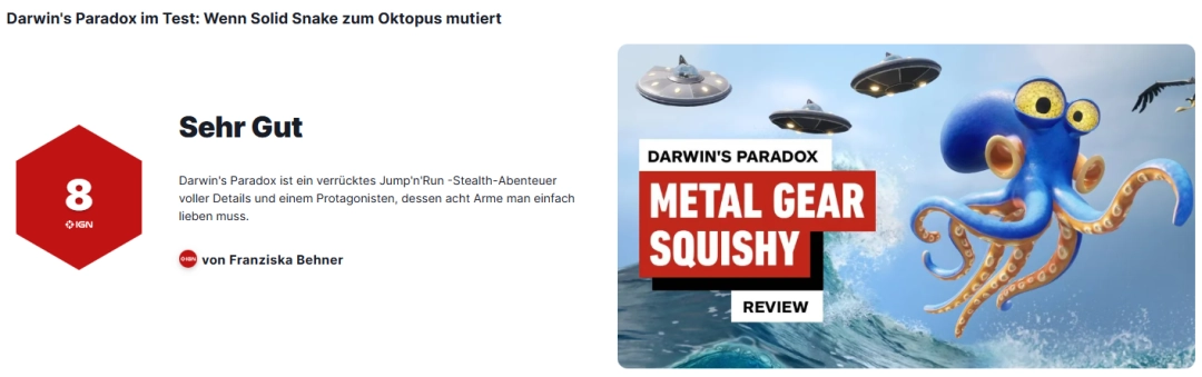 《达尔文悖论》玩起来就像是平台跳跃、潜行和解谜的经典大杂烩。所有这些元素在一个横版卷轴式的关卡设计中奇妙地融为一体。各个区域在视觉上非常有深度:背景中常常发生太多事情,以至于我们完全被分散了注意力,让达尔文直接撞上明晃晃的刀刃,就为了欣赏一下环境。抱歉了,达尔文!我们最爱的部分是对达尔文本人的塑造:他现在已经是我们今年最喜欢的游戏主角之一了!这只蓝色章鱼仿佛是从动画电影里蹦出来的,用它那双凸出的眼睛和可爱的吱吱声,展现出的情感比某些3A角色还要丰富。即使达尔文被障碍物压扁、眼珠都从脸上滚出来,不知怎的也还挺可爱,并让我们心生怜悯。而且我们也知道,他很快就会满血复活出现在屏幕上,再次尝试。《达尔文悖论》在操控、镜头和视野方面存在一些小问题,但其出色的演出完全弥补了这些不足。游戏流程约8小时,在玩法和视觉上都提供了丰富的多样性,加上频繁的快速存档点,也很有动力让人继续玩下去。各个关卡从不会让人觉得无法通过,反而会激发你再试一次的斗志。再试一次。再来最后一次!直到你见证《达尔文悖论》的结局,完成这场节奏明快、乐趣十足的小冒险。