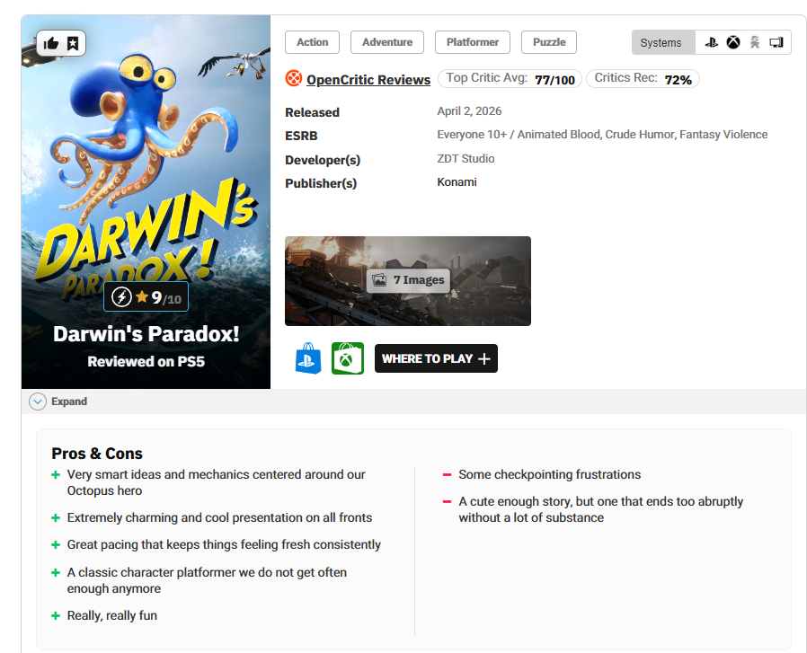 《达尔文悖论》是一款特别的吉祥物平台跳跃小游戏,它给人的感觉像是回到了PS1时代,但又拥有现代游戏的光鲜与便捷。它充满了魅力、巧妙的创意和有趣的玩法,章节之间的节奏也把控得恰到好处。虽然游戏可爱至极,但它的叙事并未达到它似乎致敬的皮克斯电影那样的高度,而且结局相当突然,留在了悬念处。这一点,再加上偶尔令人头疼的检查点问题,是这部在其他方面都令人无比喜爱的作品中仅有的瑕疵。去玩这款游戏吧,像这样的作品不常有。