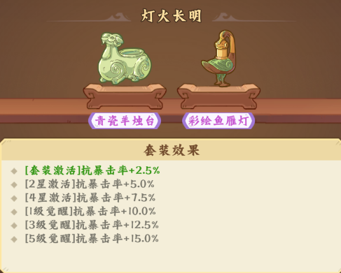 提供抗暴击率加成,首次激活/2星/4星/1级觉醒/3级觉醒/5级觉醒:2.5%/5.0%/7.5%/10%/12.5%/15.0%抗暴击率。