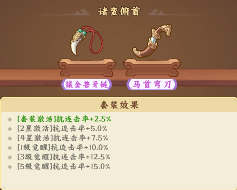 提供抗连击率加成,首次激活/2星/4星/1级觉醒/3级觉醒/5级觉醒:2.5%/5.0%/7.5%/10%/12.5%/15.0%抗连击率。