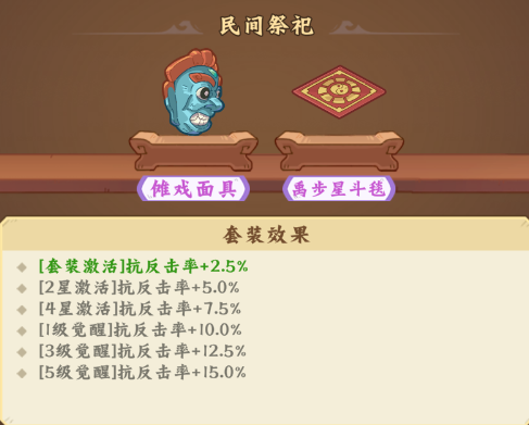 提供抗反击率加成,首次激活/2星/4星/1级觉醒/3级觉醒/5级觉醒:2.5%/5.0%/7.5%/10%/12.5%/15.0%抗反击率。