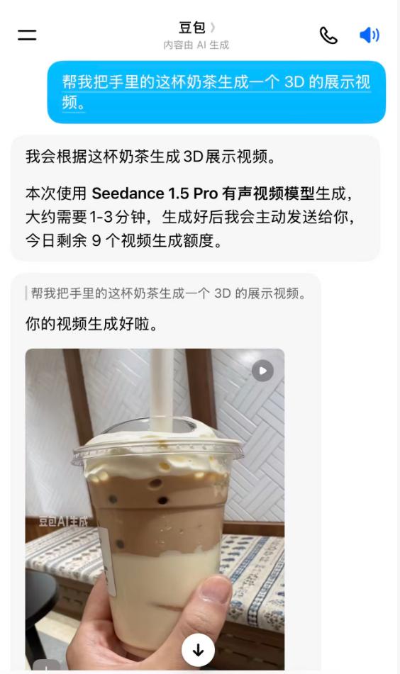 除了图片,豆包还能生成视频,可以直接告诉他要求,也可以上传图片,让图片动起来。可以生成带音轨的短视频。做短视频、电商内容、或者只是想给孩子做个有趣的小动画,手机上就能搞定。