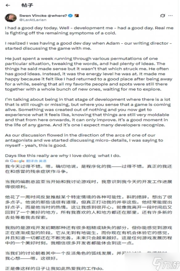 芬克表示,此次感悟源于与工作室编剧总监亚当·史密斯的交流。史密斯花一周时间打磨剧情分支、微调台词,其饱满的工作热情让芬克倍感触动,仿佛“回到熟悉的好地方,发现新惊喜正等待探索”。