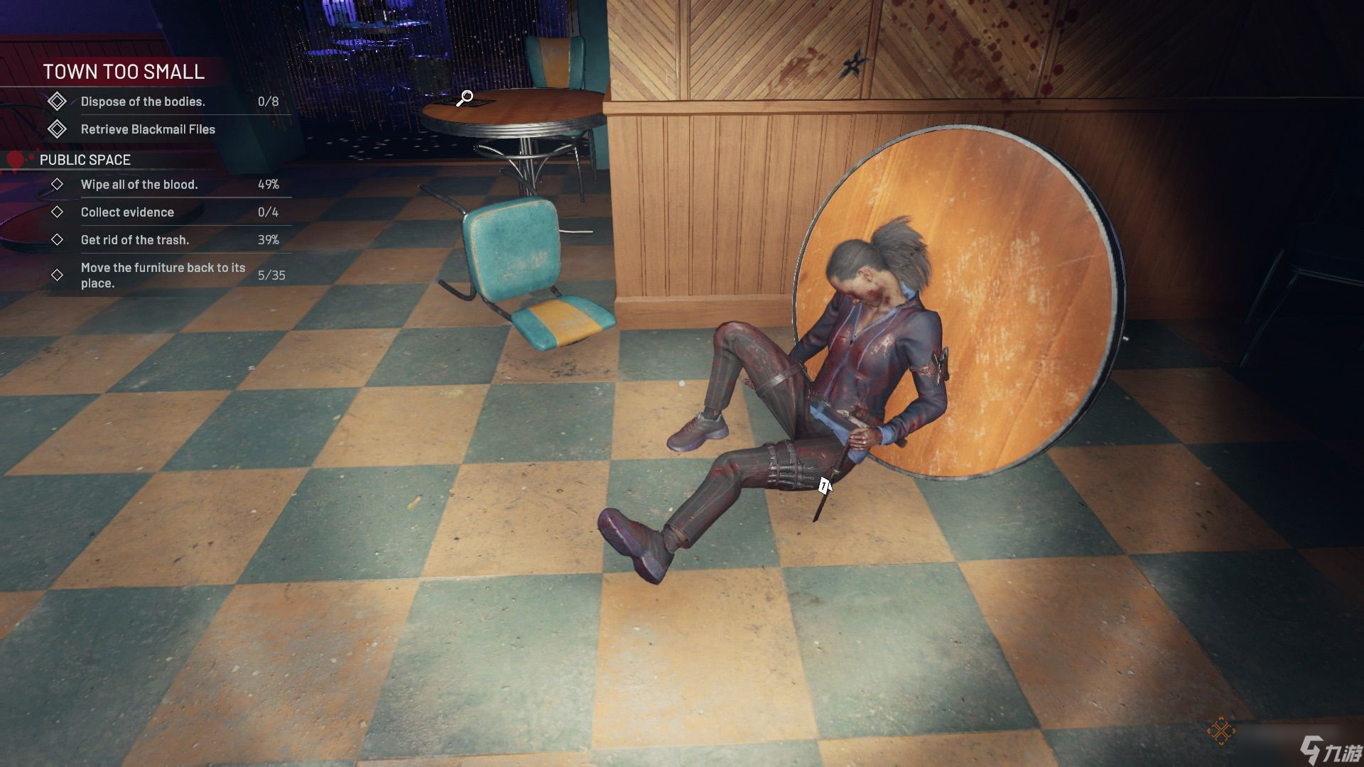 前往有街机的区域,清理并找到桌上的录音(证据)。桌上足球和台球桌区域有一具尸体需要清理,尸体上插着一根桌上足球杆(证据),其中一张台球桌下还插着一把武士刀(证据)。