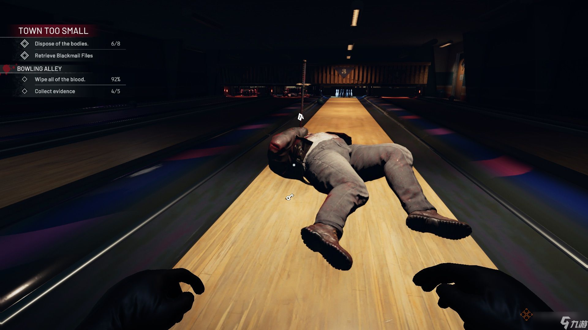 任务从你走进保龄球馆开始,公共区域呈现一片血腥景象。你的第一个水桶点在最后方,经过派对室和桌上足球区。本任务包含: