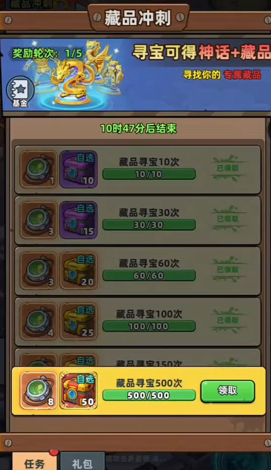 本活动另设“藏品冲刺”奖励体系:达成指定寻宝次数后,系统将额外赠送对应等级的寻宝宝箱。例如,累计10次可获基础宝箱(内含普通品质藏品),性价比尚可;当寻宝次数达100次时,可兑换传说品质宝箱;而达到500次后,则解锁红色品质宝箱——该宝箱可定向兑换神话品质藏品,是补全关键藏品缺口的最优解。因此,建议玩家以500抽为阶段性资源目标进行统筹准备。