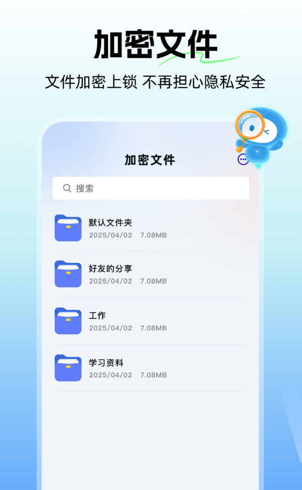 采用军工级加密标准,照片、视频、文档等各类文件加密存储后,外部无法破解也无法复制。文件批量导入后自动分类整理,支持重命名和移动操作,管理起来不乱。内置预览和播放功能,查看文件不需要导出到外部应用,不留使用痕迹。假密码功能处理得比较细,设置两套密码,输入其中一套进入的是虚假空间,遇到被强迫查看的情况能应对。