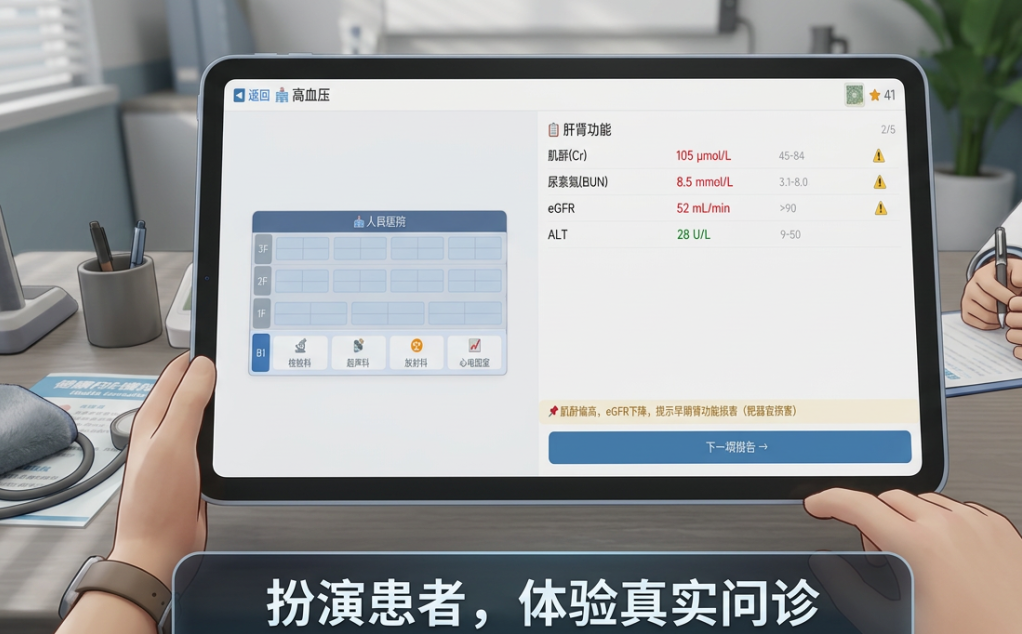 从血压测量、血糖检测到心电图分析,每一项检查均对应真实临床逻辑。玩家需依据模拟症状自主判断并选择检查项目,在操作中自然掌握常见指标含义与异常阈值。系统采用动态反馈机制,生成个性化健康评估报告,关键健康风险点以隐蔽方式呈现,鼓励玩家深度阅读与交叉验证,显著强化信息提取与逻辑推演能力。相比传统图文学习,这种“探案式”交互设计大幅提升了知识吸收效率与长期记忆留存率。