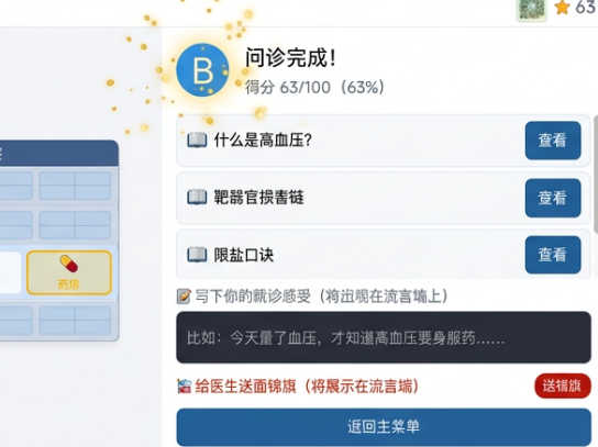 除常规问诊流程外,游戏内嵌入多层级病情模拟模块,涵盖慢性病管理、急性症状鉴别等典型场景,有效锻炼玩家的临床思维与决策能力。内置流言墙社区支持用户分享问诊策略、复盘诊断思路,并可通过赠送锦旗等形式实现正向互动。该社交机制不仅增强用户粘性,更助力玩家将虚拟经验迁移至现实医患沟通中,提升主动健康管理信心。