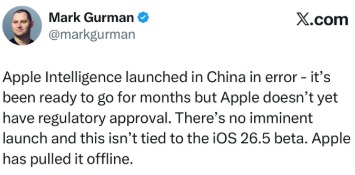 Apple智能于2024年发布,仅支持iPhone 15 Pro及更新机型、新款iPad和Mac,作为苹果生态的核心AI功能,却因监管审批问题,国行版本始终未能落地,此次突然开放入口,让不少用户误以为该功能正式登陆国内。知名记者Mark Gurman也发文确认,此次上线纯属意外,Apple智能国内版尚未获得监管批准,且该情况与iOS 26.5测试版无关。