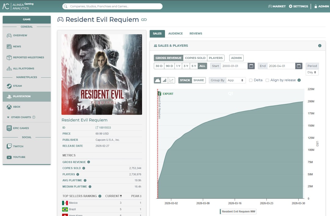 Alinea Analytics指出,《生化危机9》PS5版销量超过280万套,销售额超2亿美元。仅仅在三月份,就在PS5上售出了超过190万套。